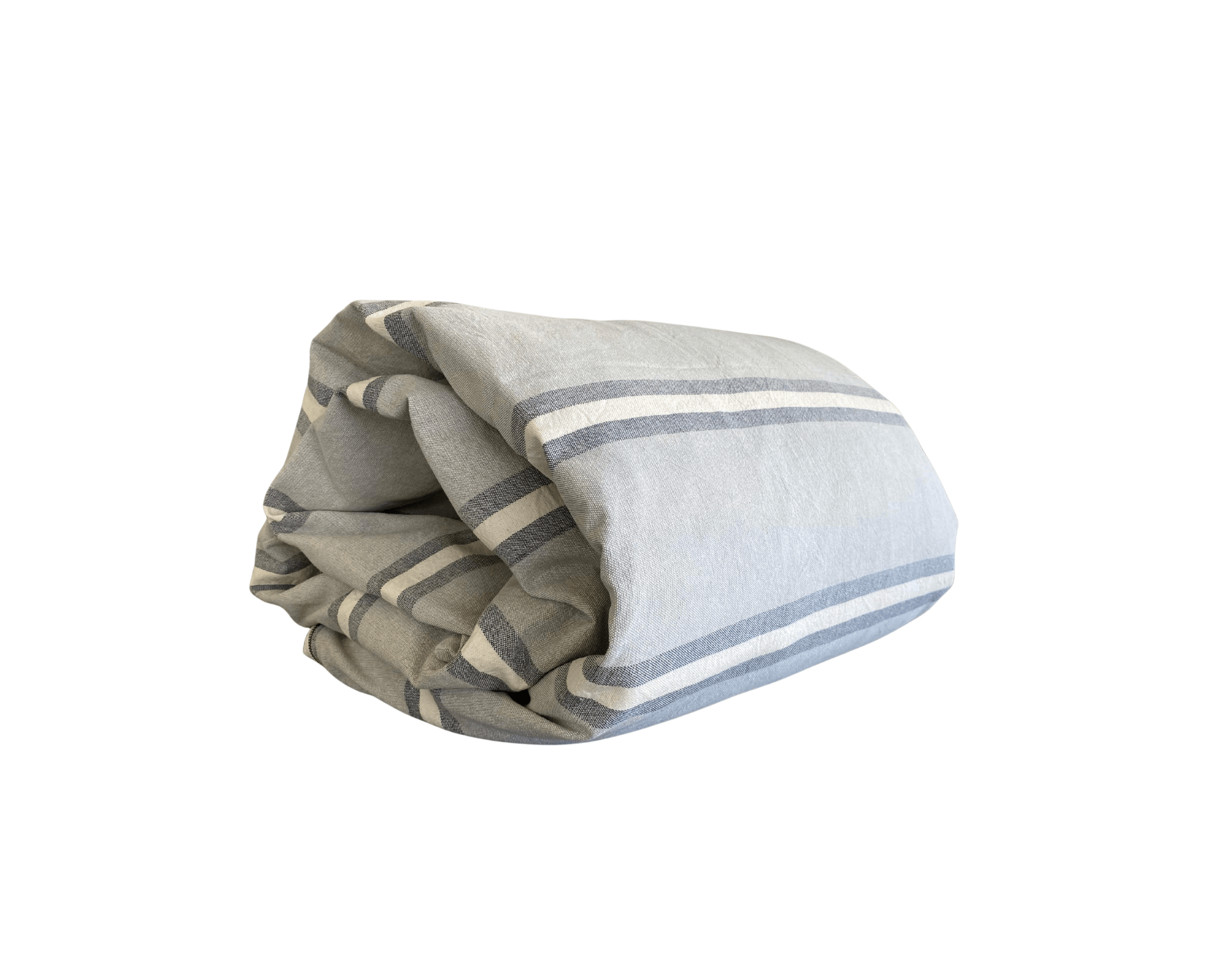 - Diseño a rayas en color color gris oscuro, gris claro y crudo/ reversible en tussor natural color crudo